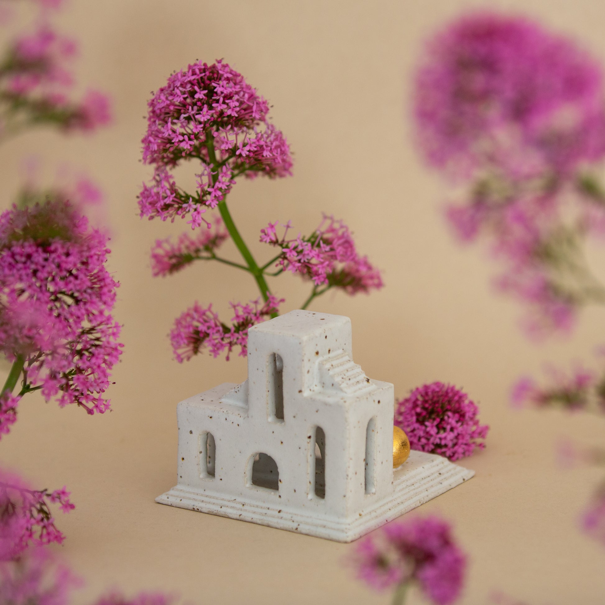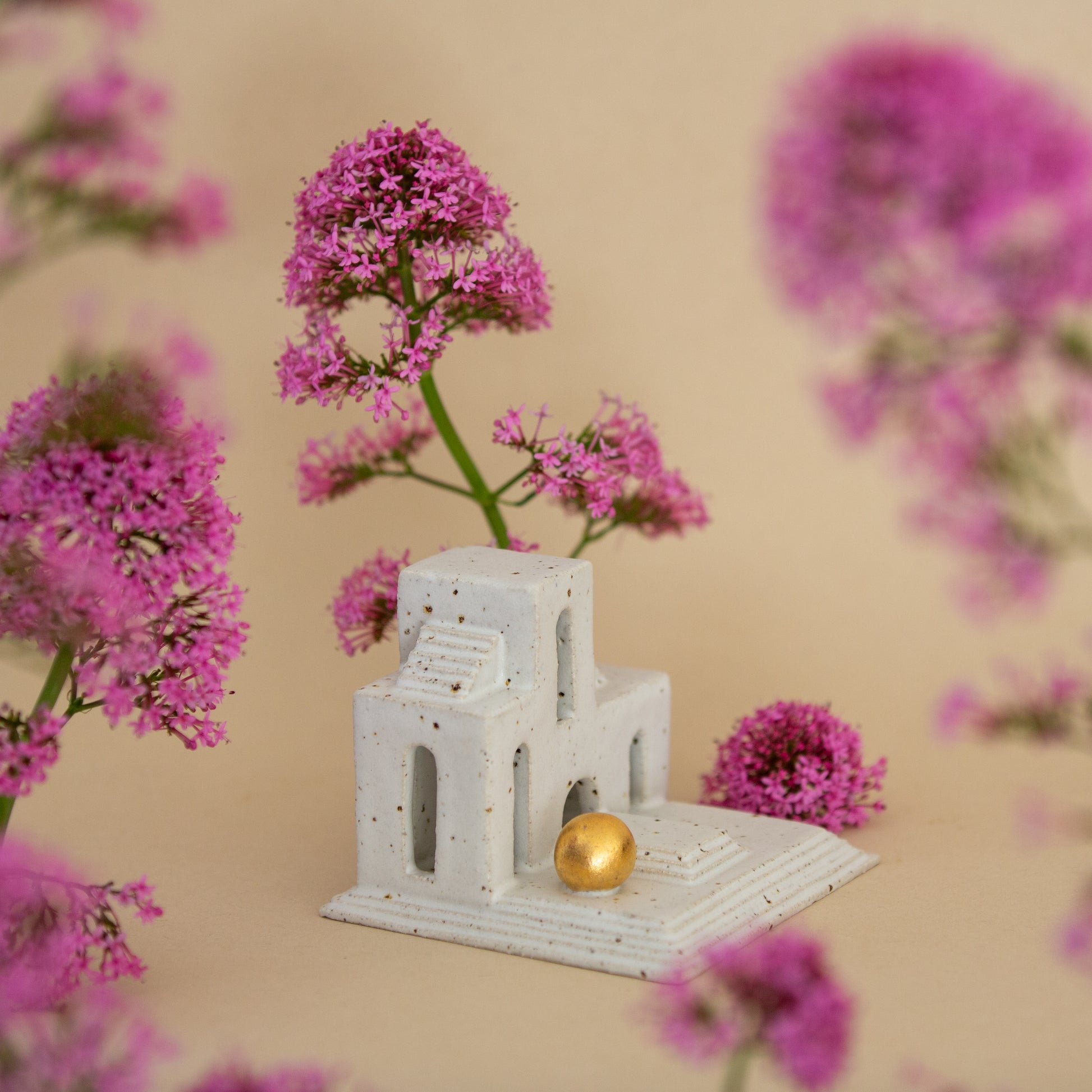 After the Rain features a series of hand-carved steps surrounding a small sphere finished with gold lustre. Delicate archways invite the viewer to explore and move through the miniature world.