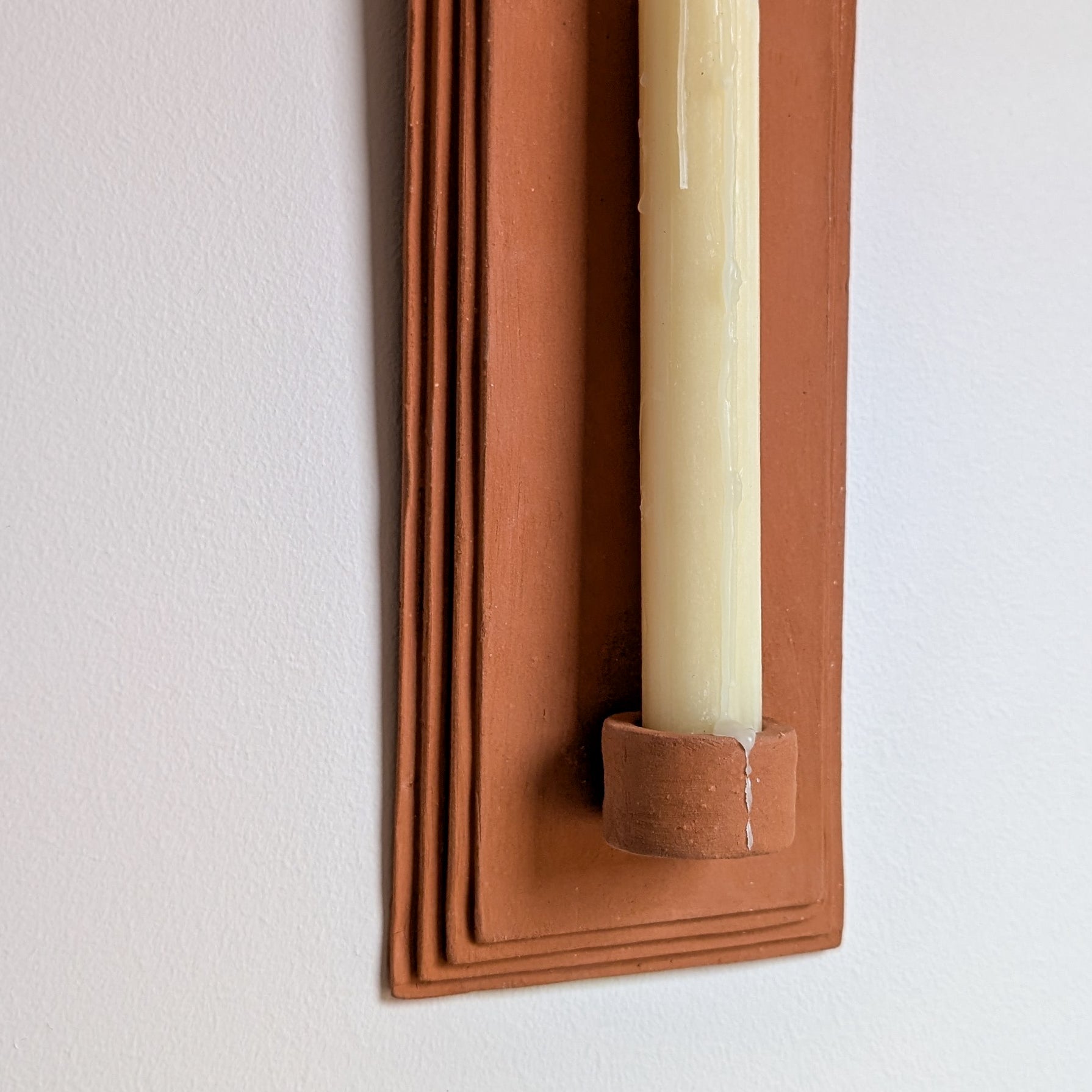 Altar to Light is a terracotta curved wall hanging handmade in my studio, designed to hold a taper candle. Each piece is hand-shaped, with subtle variations that make it truly one of a kind.