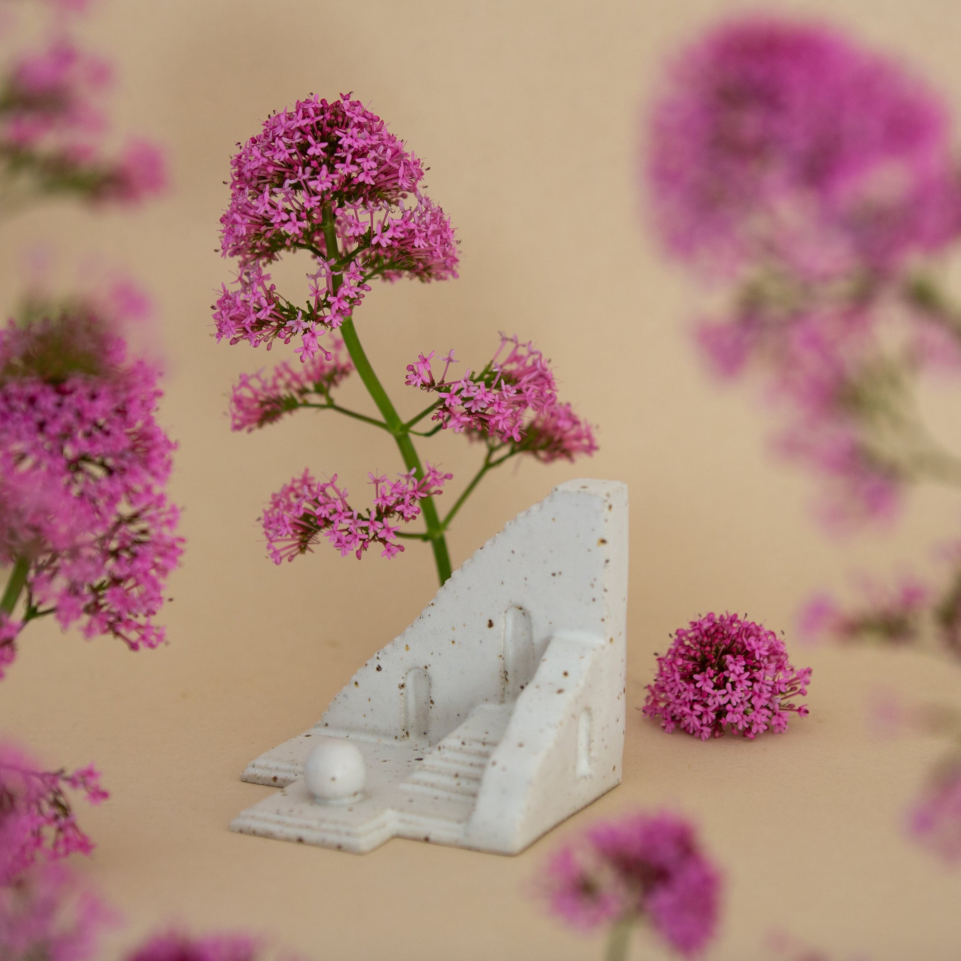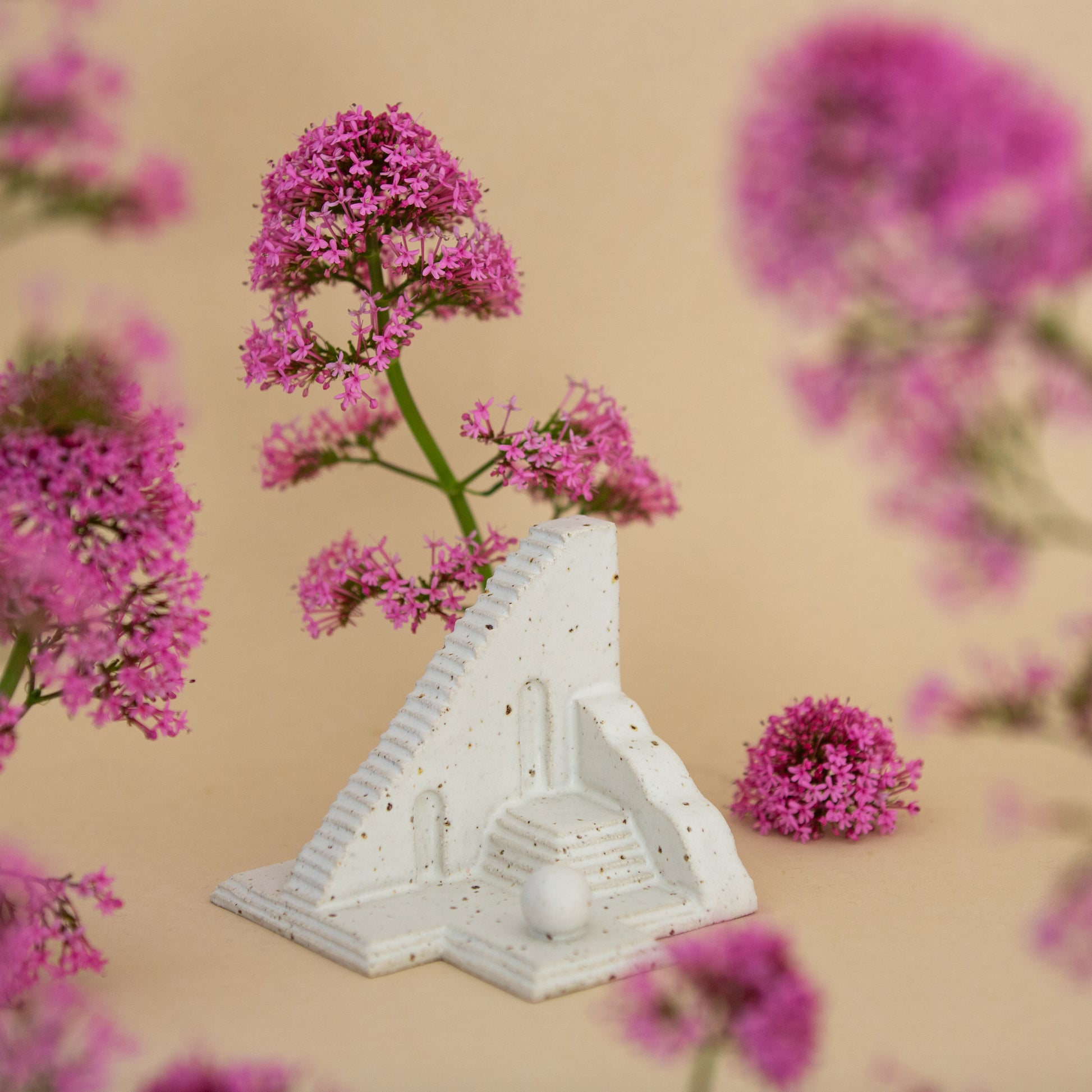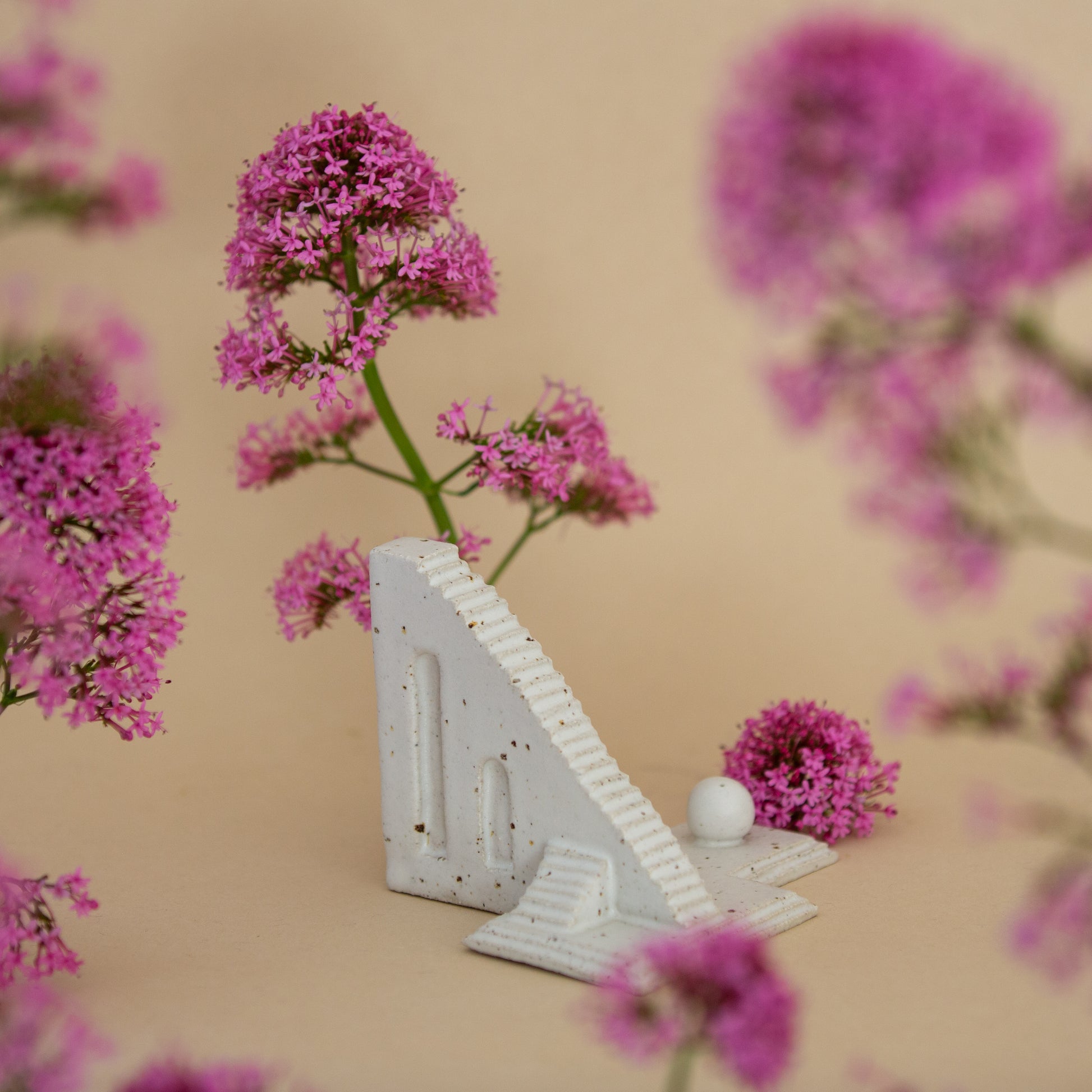 Beacon Steps features multiple tiered levels connected by a long, straight staircase, all culminating in an arched watchtower at the top. At the base, a small speckled cream orb rests, harmonising with the smooth, speckled clay surface of the sculpture.