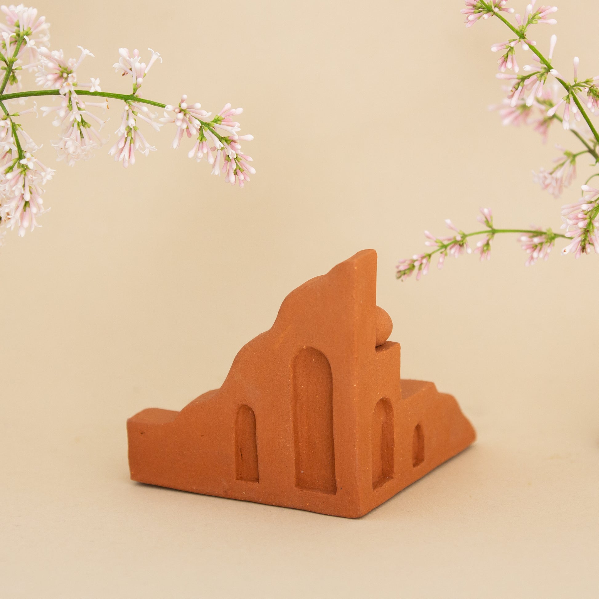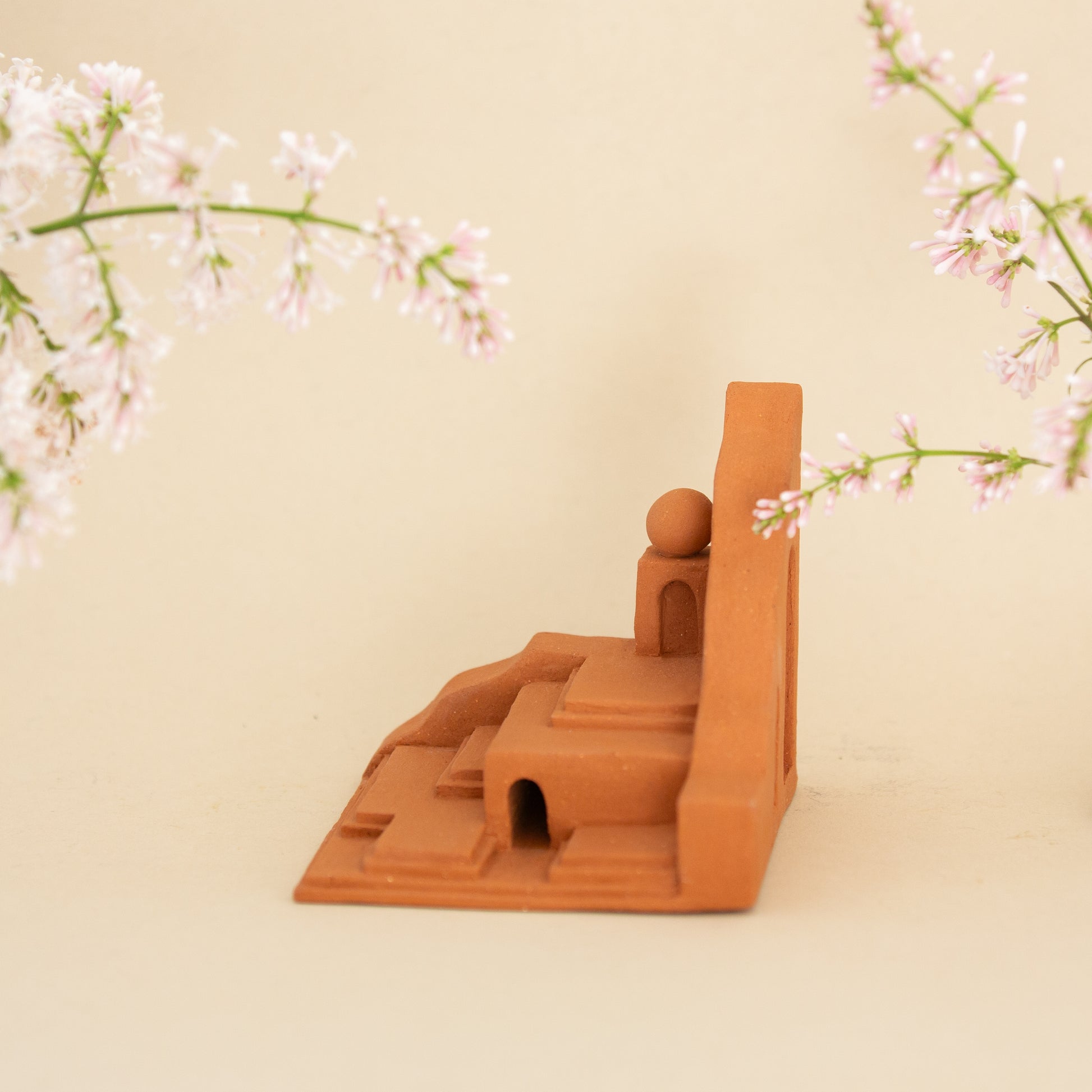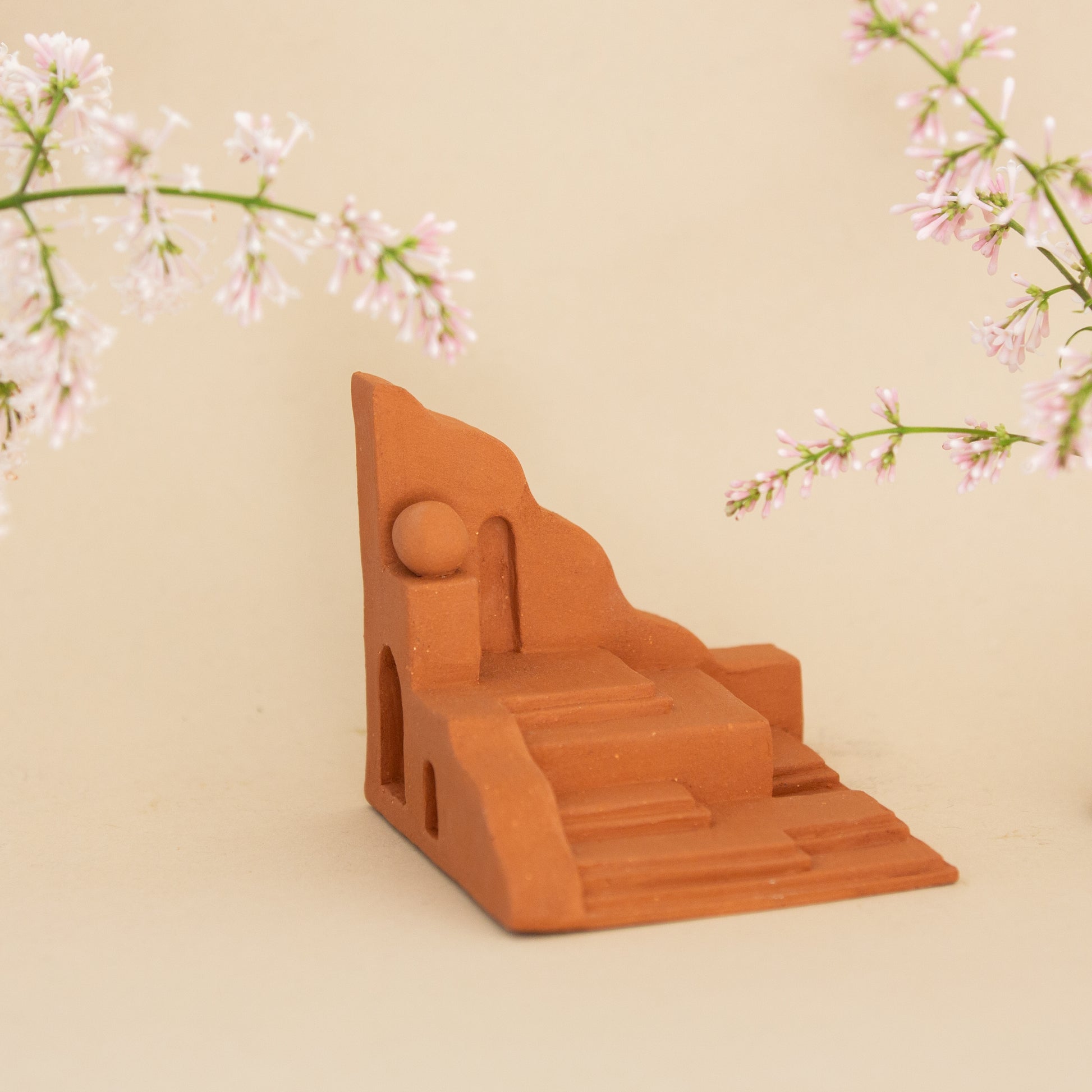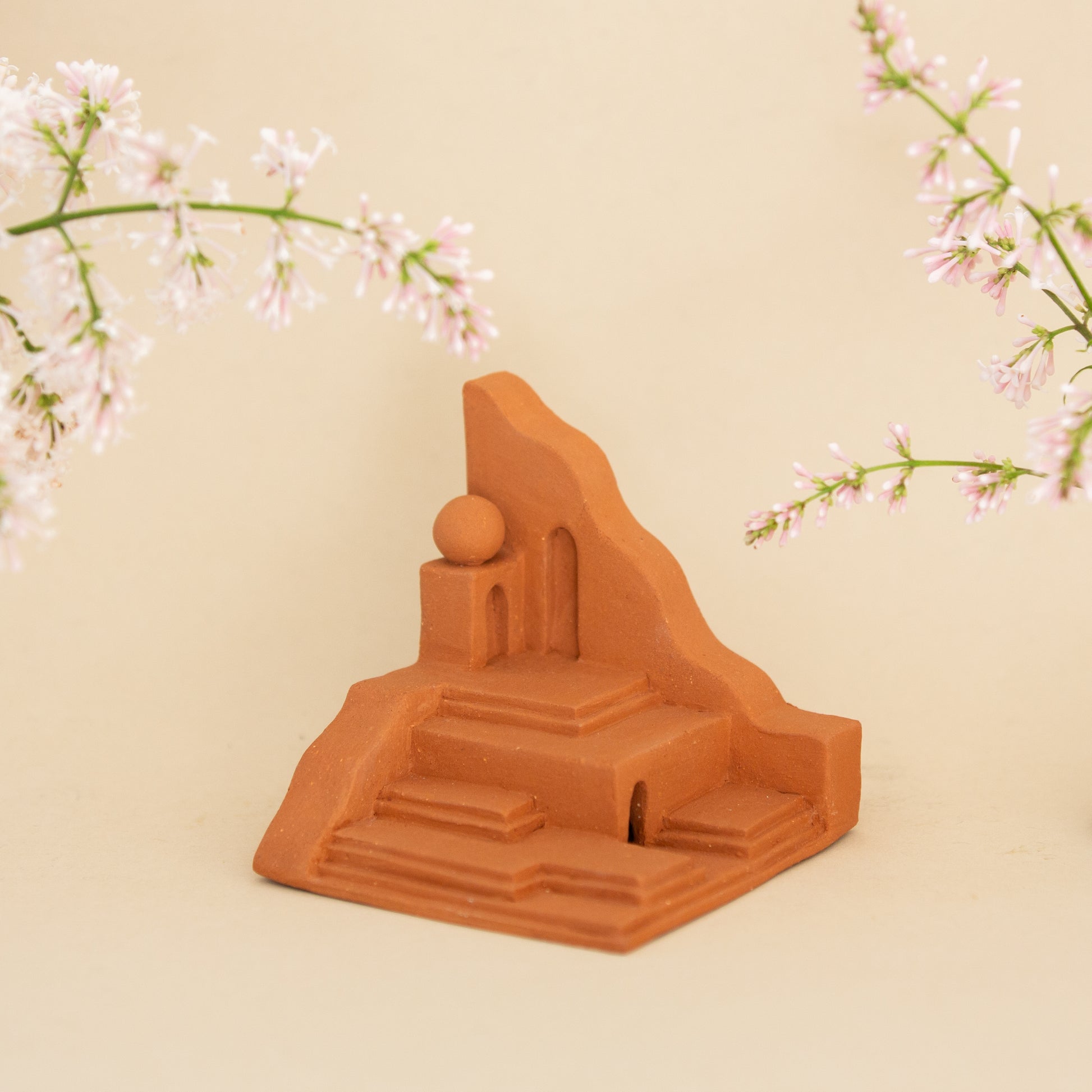 Quiet Ascent is made from warm terracotta clay and features a series of steps at multiple levels in a miniature landscape. About halfway up, a small terracotta orb rests quietly, adding a gentle pause along the climb.