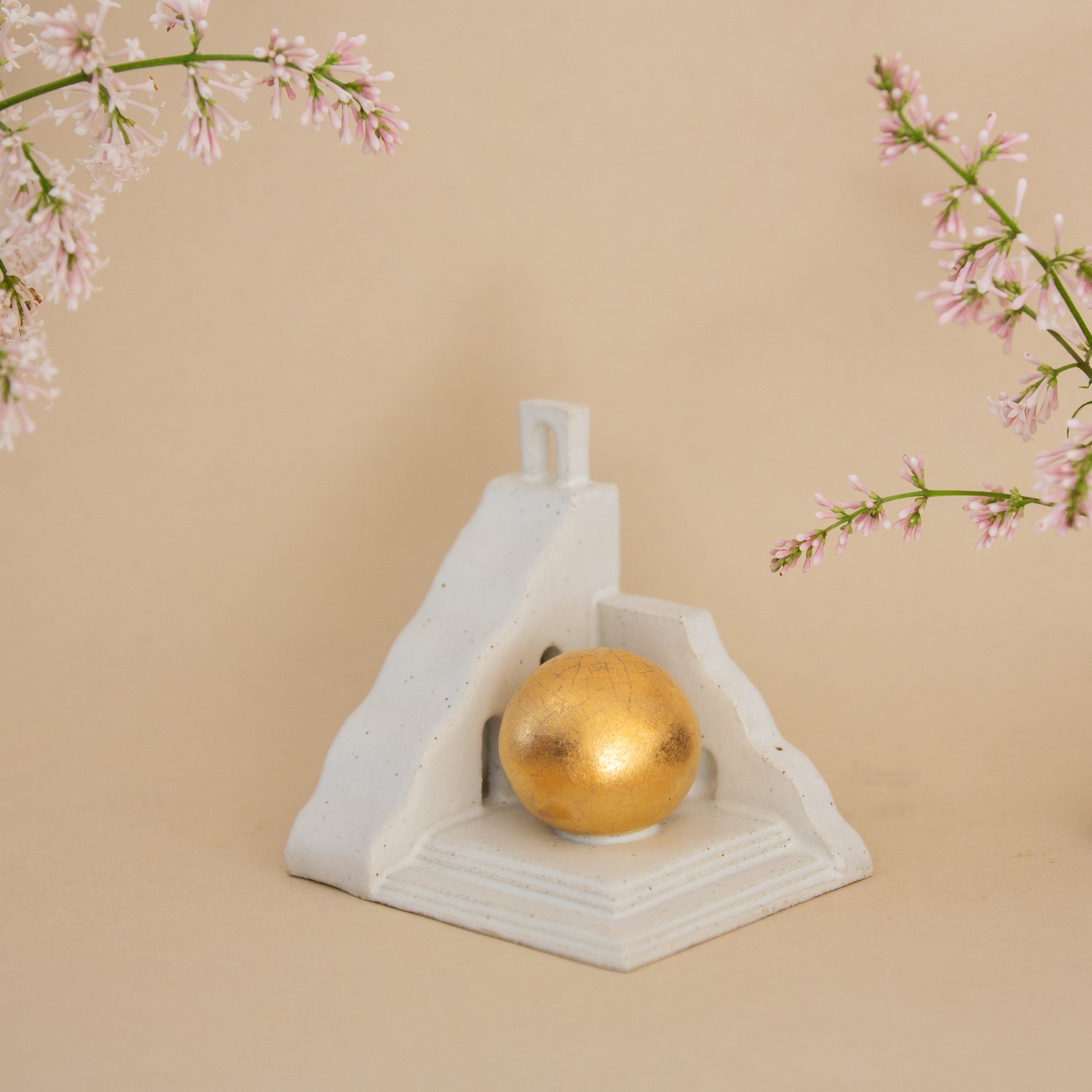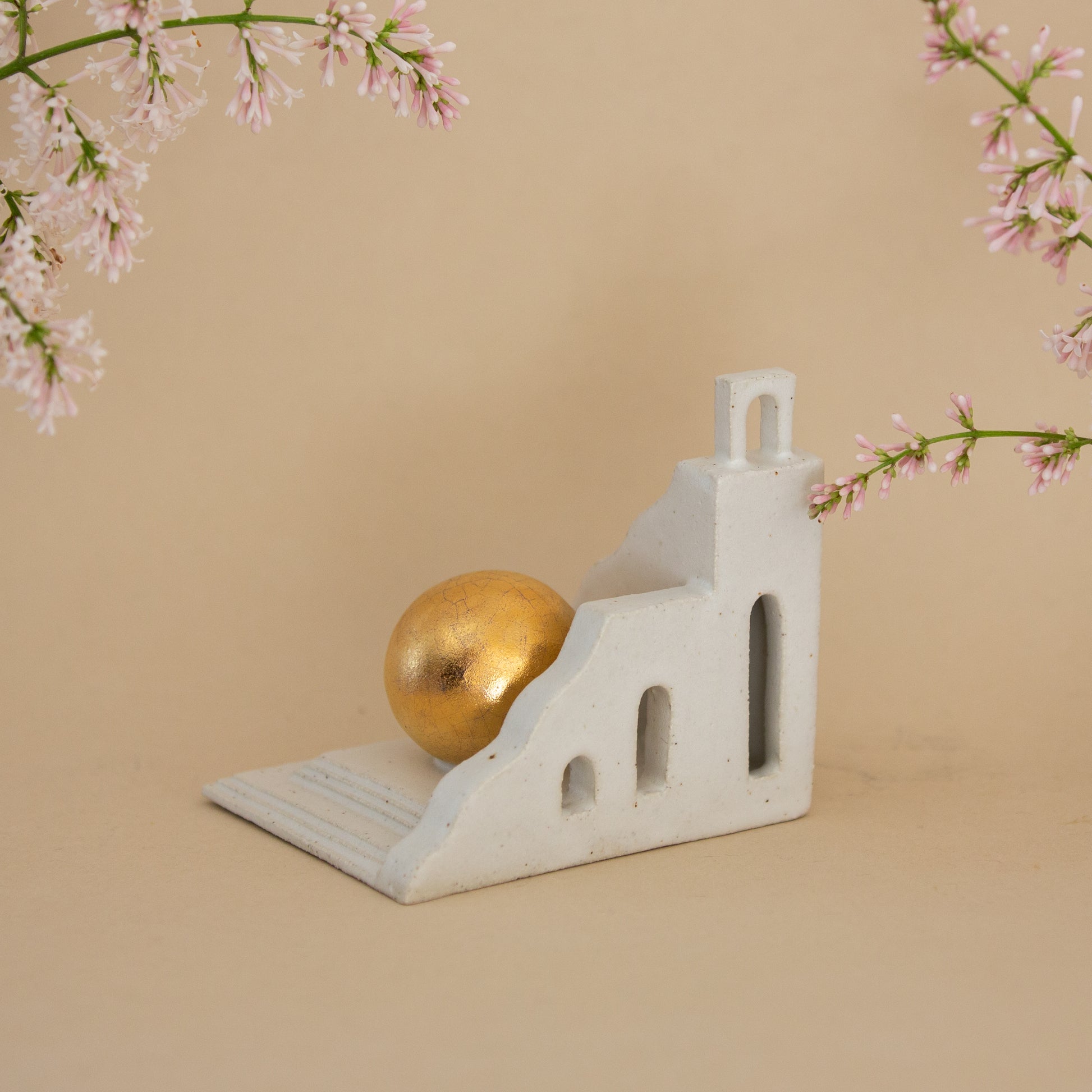 Golden Passage features a gentle curved edge that rises toward a welcoming archway at the top, while a golden orb rests below, cradled among the stairs. The flowing lines and layered levels invite the viewer to wander through this serene, miniature world.