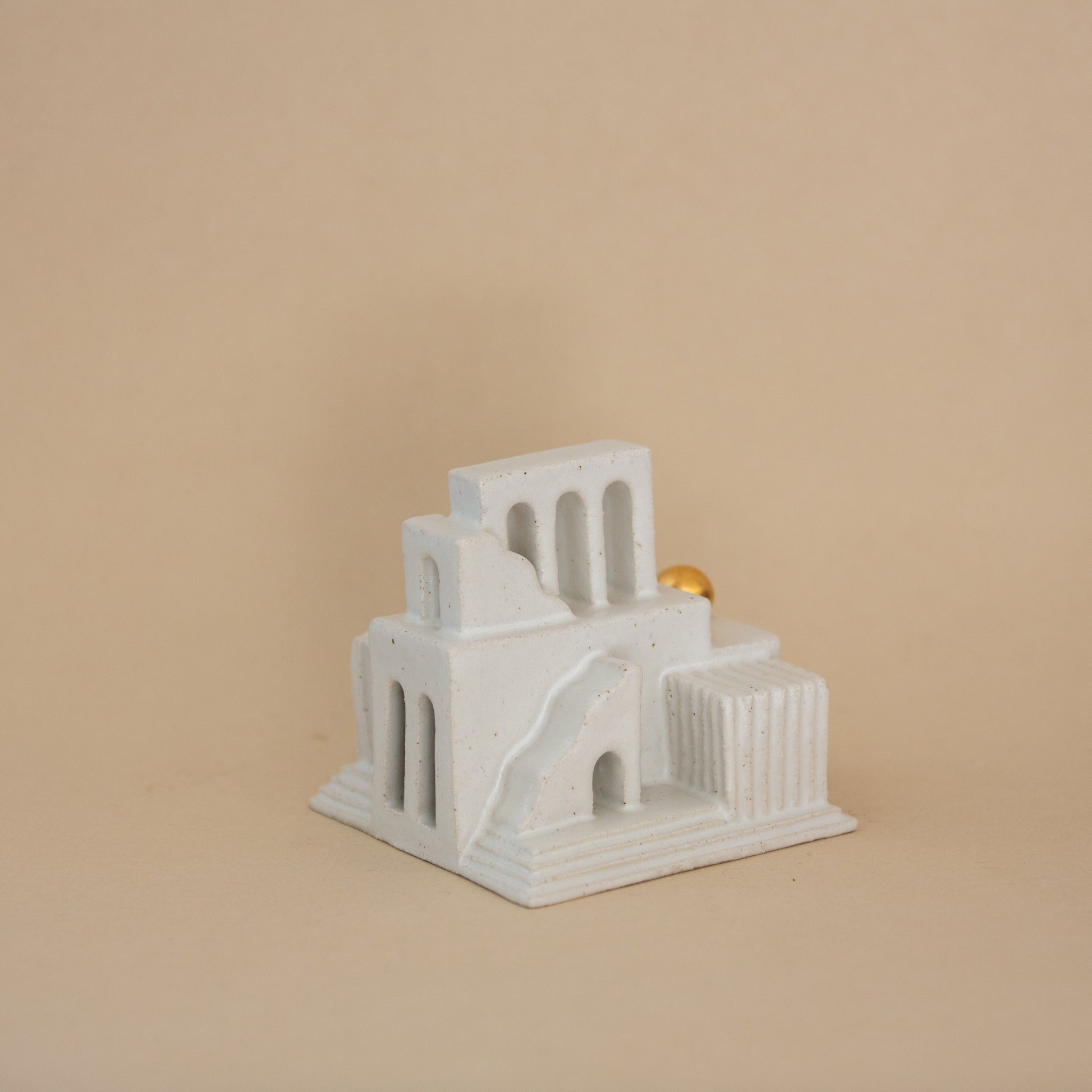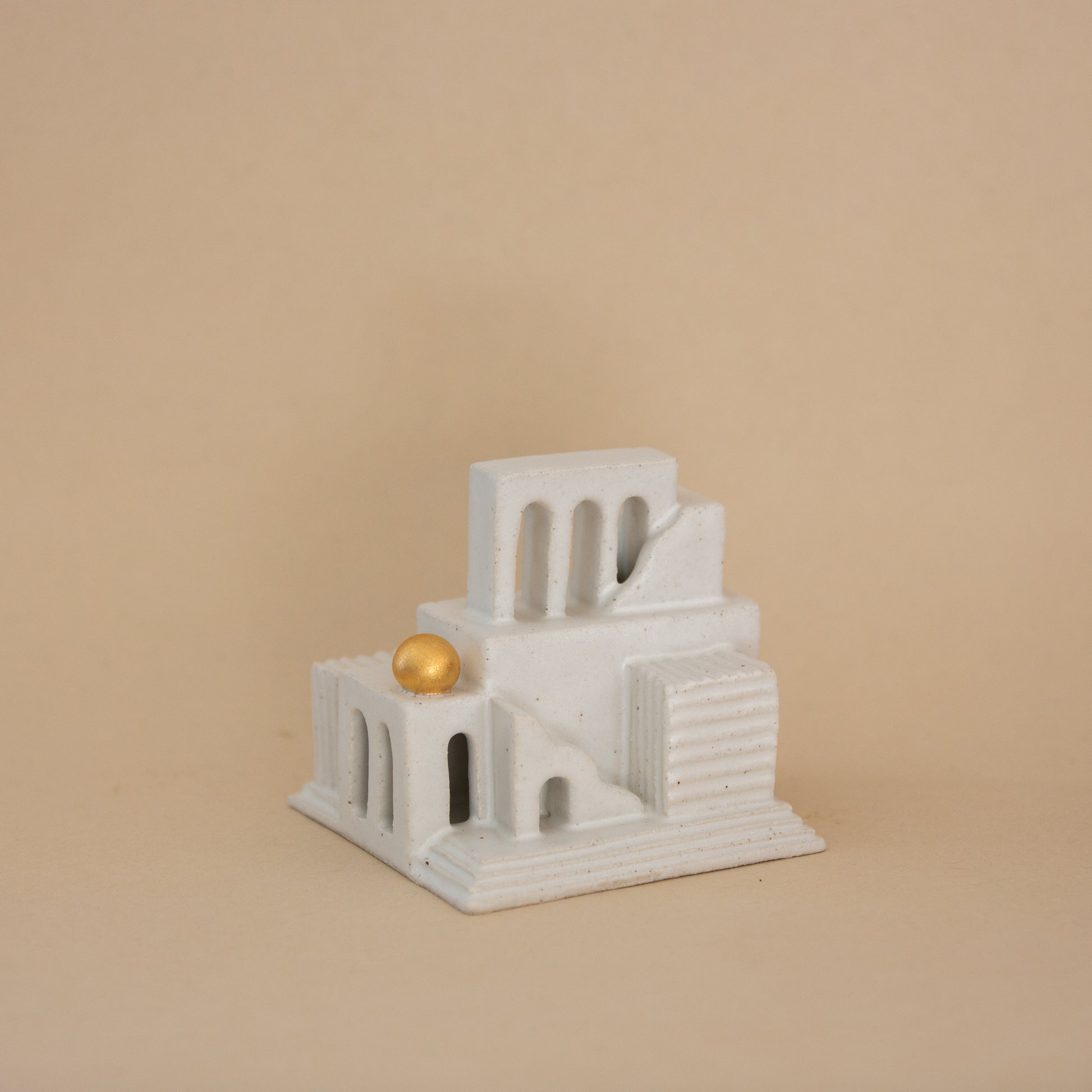 Illusion features carved details, archways, and a single golden orb perched on a rooftop. A winding series of hand-carved steps leads the eye upward, while the delicate openings invite the viewer to wander through this small, imagined world.
