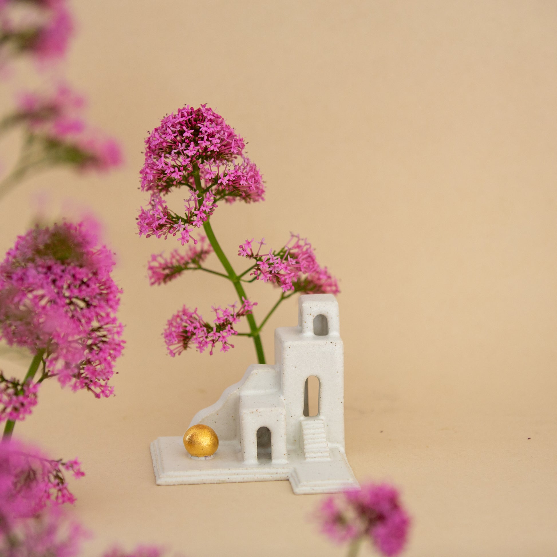 Sunwatch features multiple tiered levels with winding stairs and gently curved walls, all culminating in an arched watchtower perched above. At the base, a small golden orb rests, grounding the miniature landscape and adding a quiet focal point.