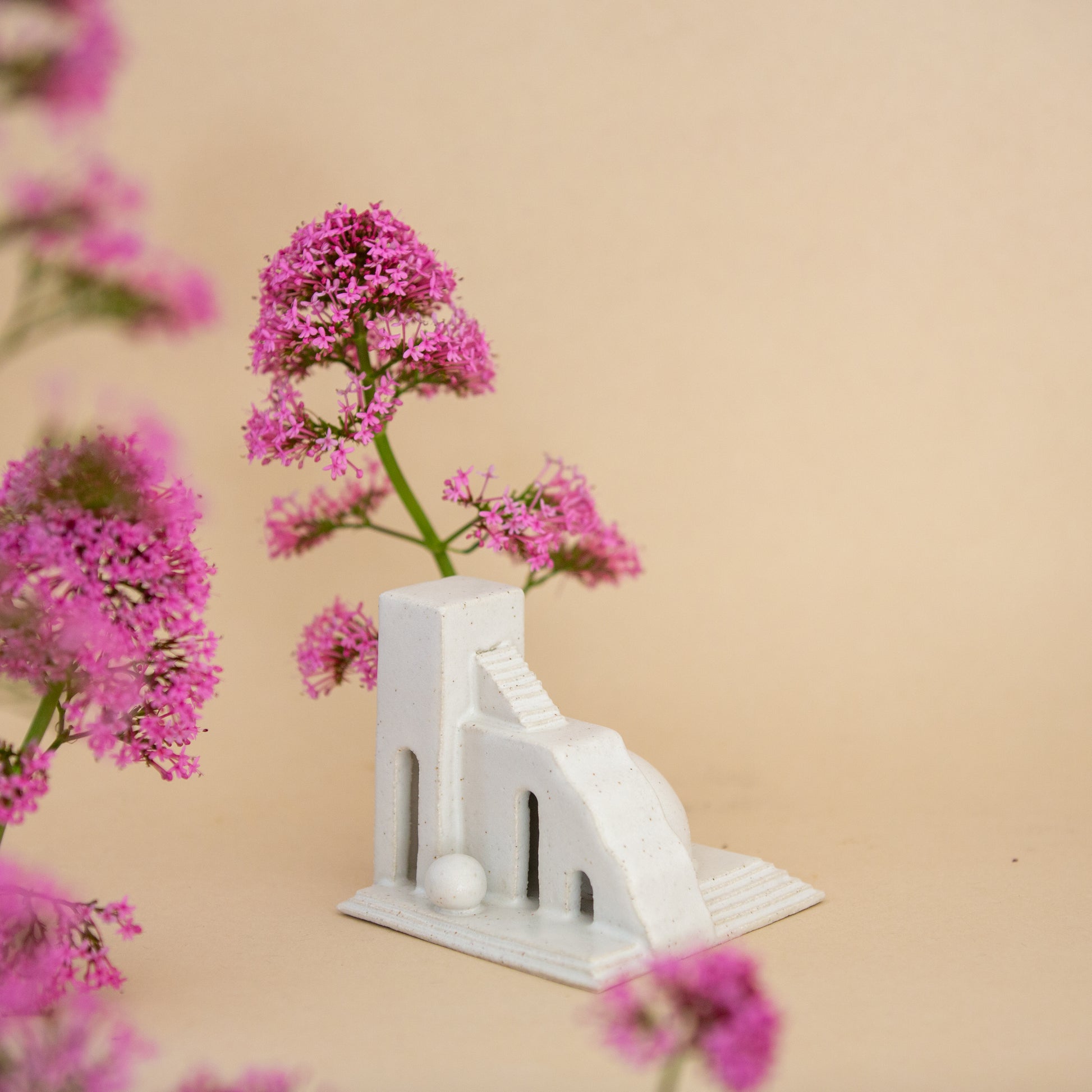 Twin Horizons features two contrasting sides: on one, delicate archways frame a small orb, while on the other, a dome emerges gracefully from the wall. Hand-carved stairs wind upward on both sides, guiding the viewer through this layered, miniature world.